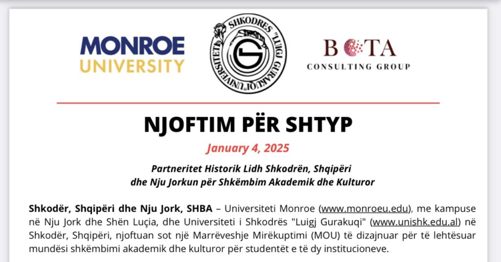 Universiteti Monroe (www.monroeu.edu), me kampuse në Nju Jork dhe Shën Luçia, dhe Universiteti i Shkodrës “Luigj Gurakuqi” (www.unishk.edu.al) në Shkodër, Shqipëri, njoftuan sot një Marrëveshje Mirëkuptimi (MOU) të dizajnuar për të lehtësuar mundësi shkëmbimi akademik dhe kulturor për studentët e të dy institucioneve.